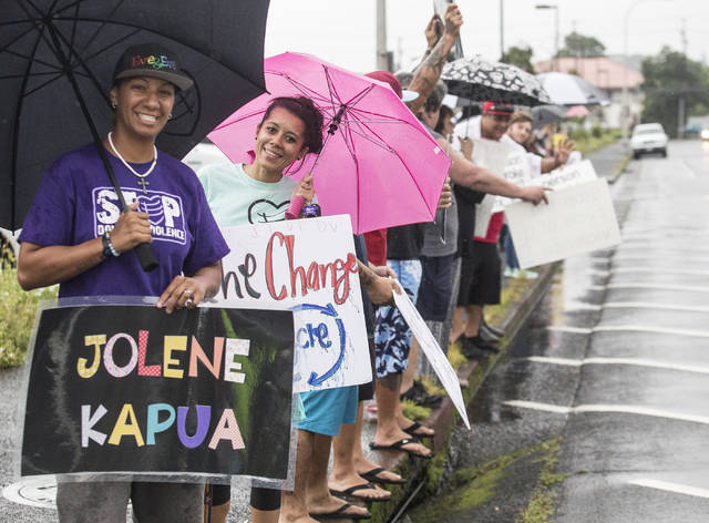 Sign-wavers line Pauahi Street on Oct. 12 during the annual Domestic Violence Family Peace Walk and Vigil outside the Aupuni Center in Hilo.