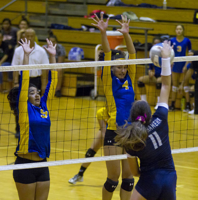 Hilo's Mahala Ka‘apuni (4) and Tia Leao (9) attempt to block a shot by Kamehameha's Tiani Bello (11) last week during teh Vikings victory in the BIIF Division I championship game at Konawaena High School.