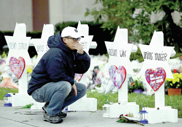 A person pauses in front of Stars of David with the names of those killed in a deadly shooting at the Tree of Life Synagogue, in Pittsburgh, Monday, Oct. 29, 2018. (AP Photo/Matt Rourke)