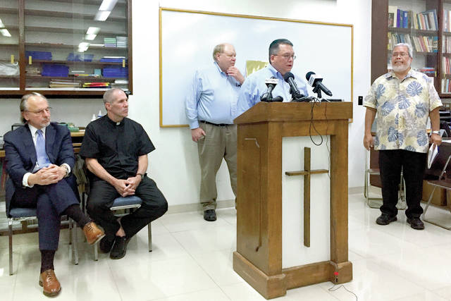Attorney Keith Talbot speaks at a news conference in Hagatna, Guam, where the Catholic Church in Guam announced that it will file Chapter 11 reorganization bankruptcy, Wednesday, Nov. 7, 2018. The move will allow the archdiocese to avoid trial in dozens of lawsuits alleging child sexual abuse by priests and move toward settlements. Talbot said the funds for future victims claims will come from the sale of non-essential church properties and insurance. (AP Photo/Grace Garces Bordallo)