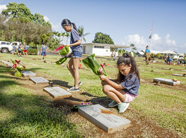 From left, Waiakeawaena Elementary School fifth-graders Tracy Huymh, 10, and Ku‘ulei Kaiwi, 10, and their classmates place floral arrangements on headstones Friday, honoring veterans as part of the students’ Veterans Day project at East Hawaii Veterans Cemeteries No. 1 and No. 2 in Hilo.