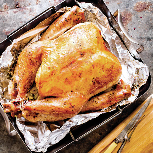 After roasting, we allowed the turkey to rest so the juices could redistribute. If you are reluctant to rotate the turkey, skip the step of lining the V-rack with foil and roast the bird breast side up for the full time. Serve with Make-Ahead Turkey Gravy (recipe follows).