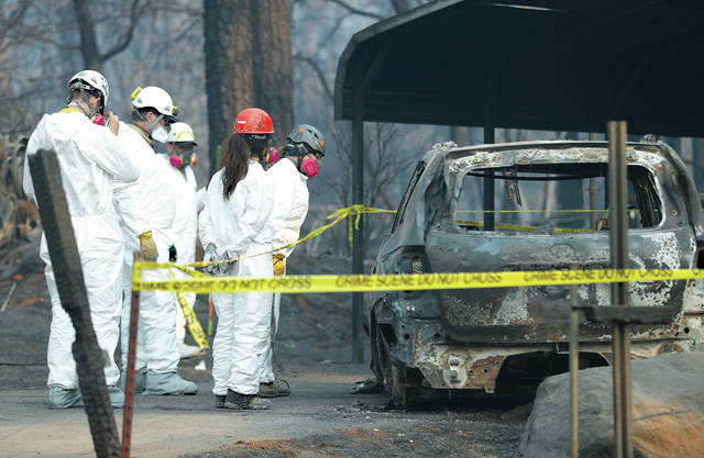 Search and rescue personnel peer into a car with suspected human remains at the Camp Fire, Friday, Nov. 16, 2018, in Paradise, Calif. (AP Photo/John Locher)