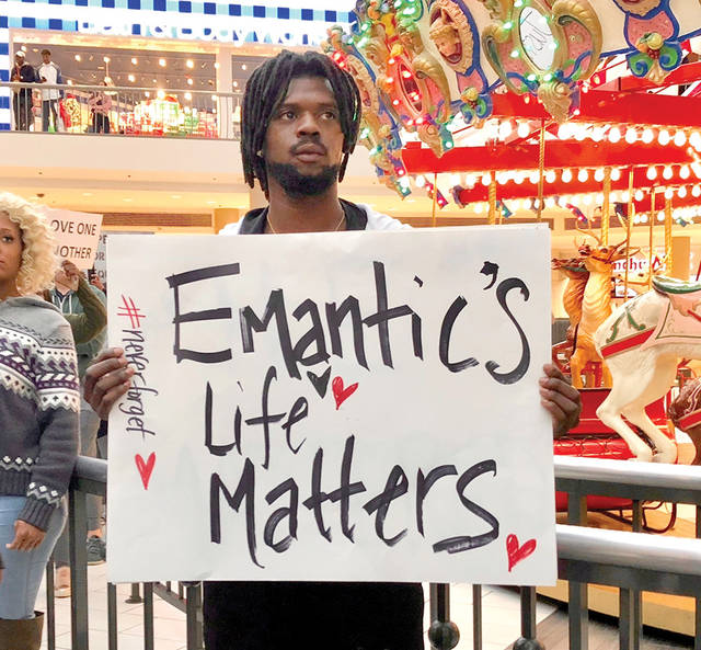 More than 200 demonstrators, including several relatives, chanted “E.J” and “no justice, no peace” as they marched past Christmas shoppers at the mall.