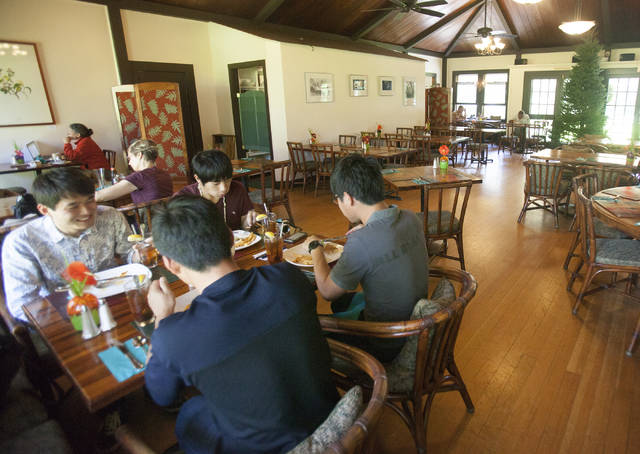 HOLLYN JOHNSON/Tribune-Herald Guests have lunch Wednesday at Kilauea Lodge in Volcano. The lodge reports a shortage of visitors, despite the reopening of nearby Hawaii Volcanoes National Park.