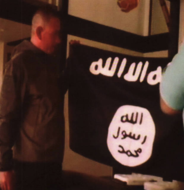 FILE - In this undated file image taken from FBI video and provided by the U.S. Attorney's Office in Hawaii on Thursday, July 13, 2017, Army Sgt. 1st Class Ikaika Kang holds an Islamic State group flag after allegedly pledging allegiance to the group at a house in Honolulu. On Tuesday, Dec. 4, 2018, Kang is scheduled to be sentenced for trying to help the Islamic State group. (FBI/U.S Attorney's Office, District of Hawaii via AP, File)