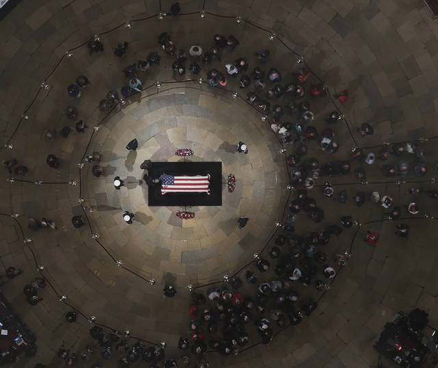 WASHINGTON — Soldiers, citizens in wheelchairs and long lines of others on foot wound through the hushed Capitol Rotunda on Tuesday to view George H.W. Bush’s casket and remember a president whose legacy included World War military service and a landmark law affirming the rights of the disabled. Bob Dole, a compatriot in war, peace and political struggle, steadied himself out of his wheelchair and saluted his old friend and one-time rival.