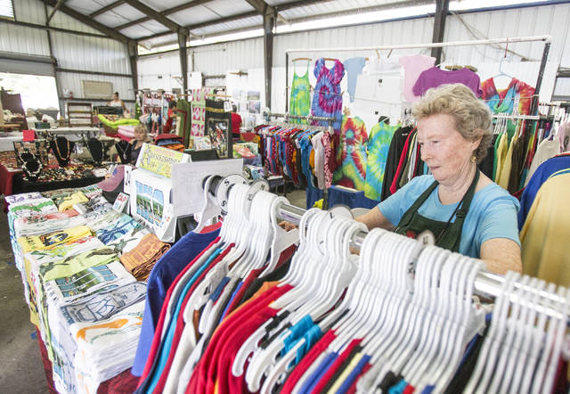 Peggy Frederick of HAWAIIANARTS.COM sells silkscreen printed merchandise Thursday during the Kama‘aina Christmas Craft Fair in the Butler Building on the Afook-Chinen Civic Auditorium grounds in Hilo. The Rotary Club of Hilo hosted craft fair continues from 9 a.m.-5 p.m. today.