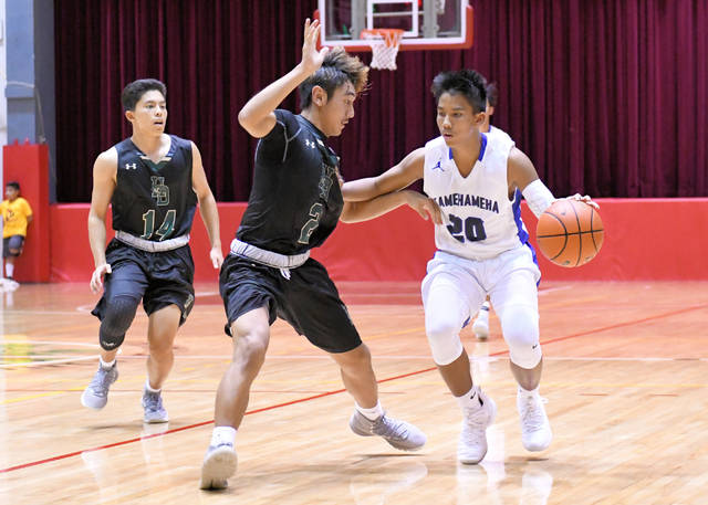 RICK OGATA photo Kamehameha’s Bobby Castillo guards Honokaa’s Kaleb Yamasaki on Friday at the Cardinal Classic at Hilo Civic. The Dragons won 61-55.
