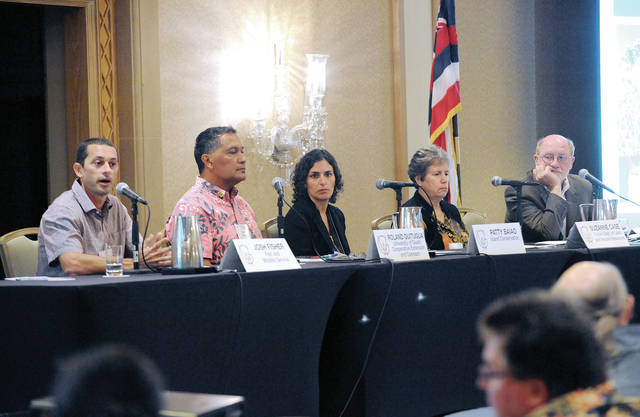 LAURA RUMINSKI/West Hawaii Today Panelists, from left, Josh Fisher, Roland Quitugua, Patty Baiao, Suzanne Case and John Laird host the Invasive Species Management on Islands workshop during the Western Governors Association Winter Meeting on Monday at The Fairmont Orchid on the Kohala Coast.