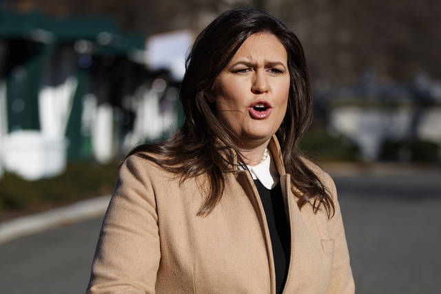 White House press secretary Sarah Huckabee Sanders talks with reporters outside the White House, Tuesday, Dec. 18, 2018, in Washington. (AP Photo/Evan Vucci)