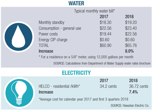 Water charges, controlled by the semi-autonomous county Department of Water Supply, also are inching up, following a five-year rate plan approved in 2015. The water bill includes an energy charge, a water consumption charge, a set standby charge and a power cost charge that fluctuates with the price of electricity.