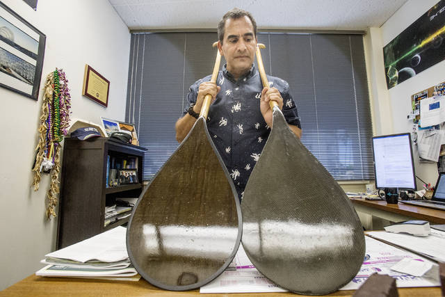 HOLLYN JOHNSON/Tribune-Herald Rodrigo Romo, Pacific International Space Center for Exploration Systems program director, holds paddles made with basalt mesh (left) and traditional fiber glass mesh (right) Friday in PISCES’ Hilo office.