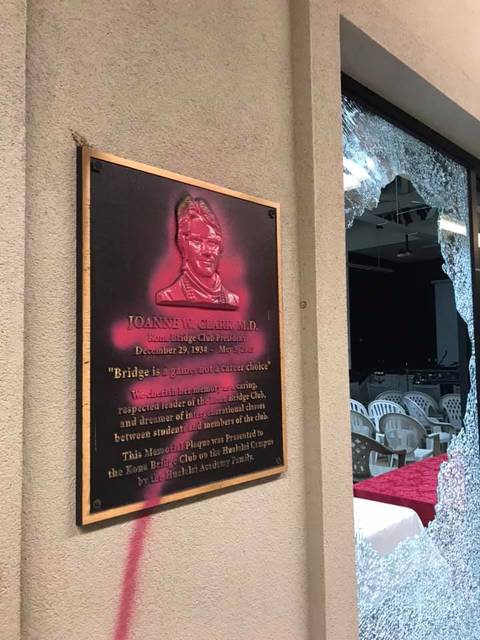 The floral shop was one of at least two other businesses damaged in Captain Cook. A vandalism report also was made on Sunday at Hope Chapel Kona located Makua Lani Christian Academy’s high school campus after seven windows were broken out and two buildings were spray painted. Nothing was stolen.