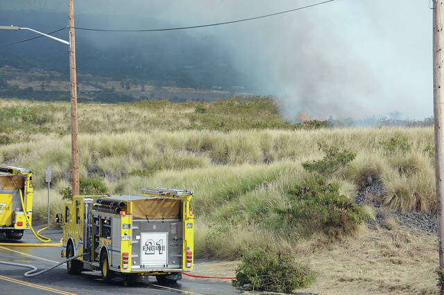 A quick spreading brush fire breaks out mauka of Kamanu Street Friday afternoon. (Laura Ruminski/West Hawaii Today)