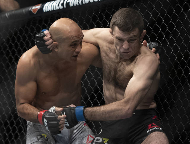 BJ Penn, left, and Ryan Hall fight Saturday during the first round of their lightweight mixed martial arts bout at UFC 232 in Inglewood, Calif.