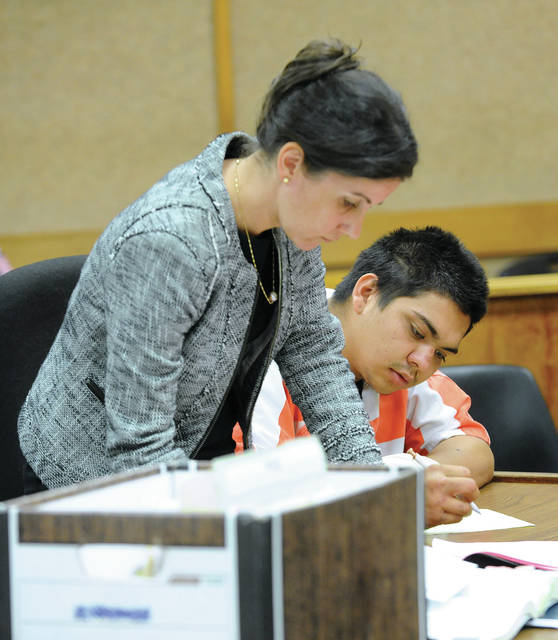 LAURA RUMINSKI/West Hawaii Today Kyle Arellano consults with his attorney, Deputy Public Defender Joanna Sokolow, during his preliminary hearing Wednesday in Kona District Court.