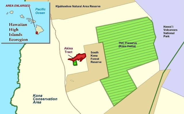 After TNC acquired 4,000 acres next door at Honomalino in 1999 — the first of three adjoining parcels that make up its Kona Hema Preserve — Akina decided that one day he would donate the land to TNC.