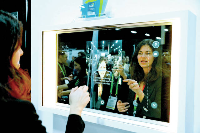 A woman demonstrates the Artemis smart mirror at the CareOS booth during CES Unveiled at CES International, Sunday, Jan. 6, 2019, in Las Vegas. The interactive mirror has video capture, virtual try-ons, facial and object recognition, and can give the user video instruction on specific makeup products, among other things. (AP Photo/John Locher)