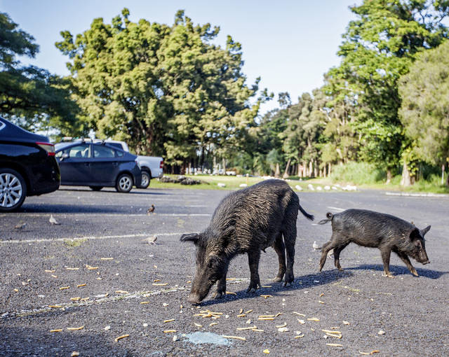 HOLLYN JOHNSON/Tribune-Herald A feral adult pig and feral adolescent pig eat french fries Tuesday in the parking lot near the boat ramp at Wailoa State Recreation Area in Hilo.