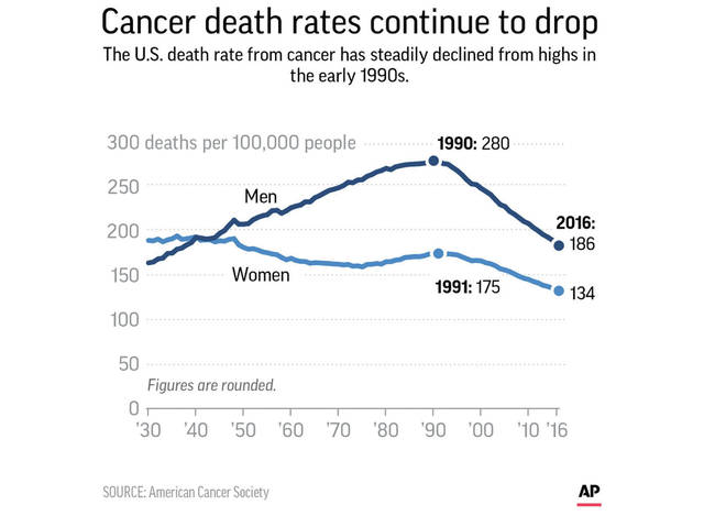 The nation’s cancer death rate was increasing until the early 1990s. It has been dropping since, falling 27 percent between 1991 and 2016, the Cancer Society reported.