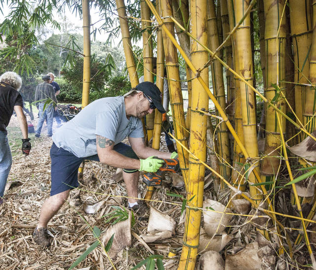 Kevin Sullivan cuts down some old bamboo Saturday during a volunteer day with the Friends of Lili’uokalani Gardens at the park on Banyan Drive in Hilo. This month’s tasks involved thinning out the bamboo thicket.