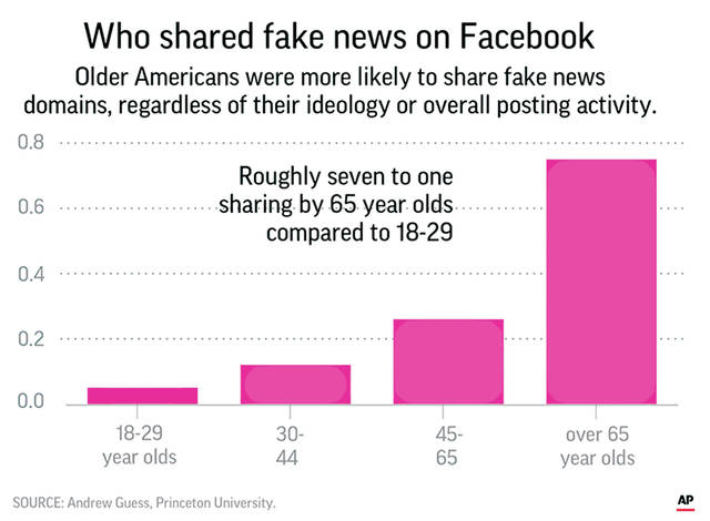 When other demographic factors and overall posting tendencies are factored in, the average person older than 65 shared seven times more false information than those between 18 and 29. The seniors shared more than twice as many fake stories as people between 45 and 64 and more than three times that of people in the 30- to 44-year-old range, said lead study author Andrew Guess, a politics professor at Princeton.