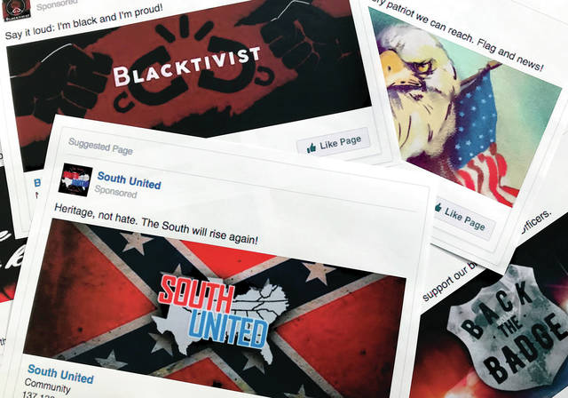 FILE - This Nov. 1, 2017 file photo shows prints of some of the Facebook ads linked to a Russian effort to disrupt the American political process and stir up tensions around divisive social issues, released by members of the U.S. House Intelligence committee, in Washington. According to a study published Wednesday, Jan. 9, 2019 in Science Advances, people over 65 and conservatives shared far more false information in 2016 on Facebook than others. Researchers say that for every piece of “fake news” shared by young adults or moderates or super liberals, senior citizens and very conservatives shared about 7 false items. Experts say seniors might not discern truth from fiction on social media as easily. They say sheer volume of pro-Trump false info may have skewed the sharing numbers to the right. (AP Photo/Jon Elswick, File)