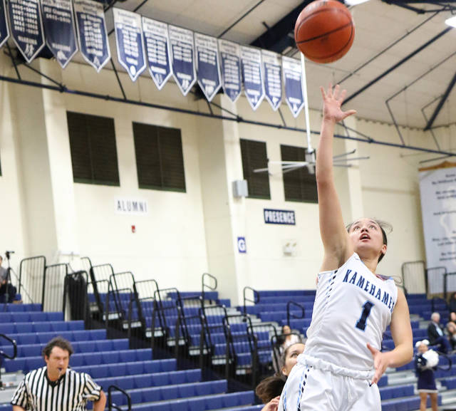 TIM WRIGHT/Tribune-Herald Kamehameha's Kailee Kuhaulua-Stacy goes up for a two points during last Wednesday in the Warriors' victory against Ka'u.