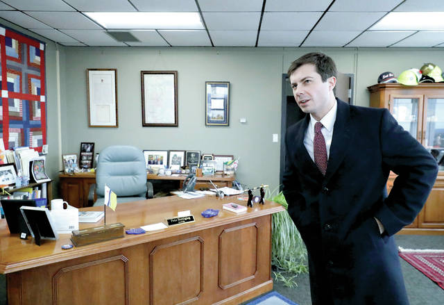 Mayor Pete Buttigieg talks with an AP reporter at his office in South Bend, Ind., Thursday, Jan. 10, 2019. Few people know Buttigieg’s name outside the Indiana town where he’s mayor, but none of that has deterred him from contemplating a 2020 Democratic presidential bid. He’s among the potential candidates who believe 2016 and 2018 showed voters are looking for fresh faces. (AP Photo/Nam Y. Huh)