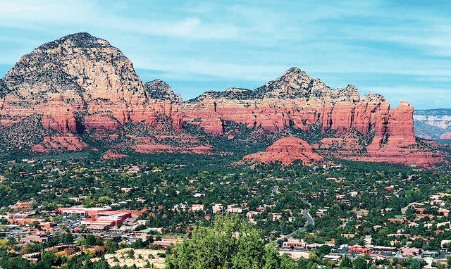 This 2018 photo shows the town of Sedona, Ariz., seen from the Airport Mesa Loop Trail. From left to right are Thunder Mountain, Sugar Loaf and Coffee Pot Rock. The sleepy Arizona town of Sedona has long been a refuge for hikers, romantics and soul searchers. There’s picturesque beauty in its earth-toned buildings and also in the glowing red rocks that surround town. And many visitors come looking for something besides this beauty: the so-called vortex where some say the earth’s energy crackles and creates sensations of healing and spiritual awakening. (AP Photo/Joseph Gedeon)