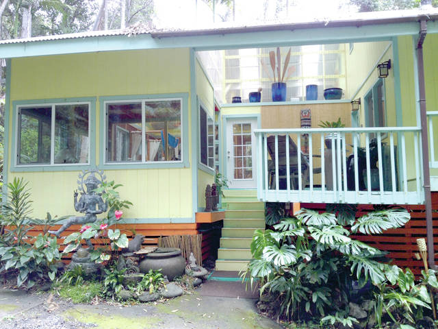 Photo courtesy of VOLTAIRE MOISE Foundation plantings of monstera, anthurium and cordyline make a transition from an asphalt drive to this remodeled barn/home. The design incorporates features of Hawaii and the Caribbean.