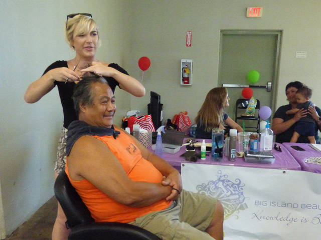 Bill Santos, seated, gets a haircut from Danielle Gramlich of Big Island Beauty Academy Saturday at the 12th Annual COMMUNITYCares Event on Saturday. (Cameron Miculka/West Hawaii Today)