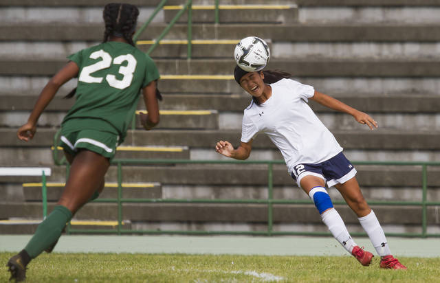 RICK WINTERS/West Hawaii Today Waiakea's Keilee Silva heads the ball as Konawaena's Jadyn Hanks (23) approaches during a BIIF Division I semifinal game in Kealakekua on Monday. The Wildcats won 3-0.