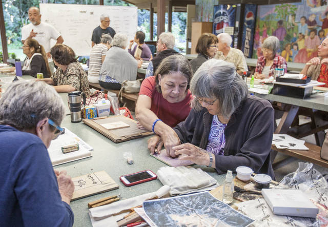 Ruth Katsunuma, left, and Charlene Asato look at each other’s woodblocks during the Woodblock Printmaking class Jan. 11 at Kamana Senior Center in Hilo.