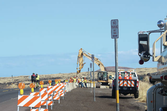 State Department of Transportation crews on Thursday install concrete barriers along the mauka side of Queen Kaahumanu Highway near the entrance to the Huehue lava tube in North Kona. (Chelsea Jensen/West Hawaii Today)
