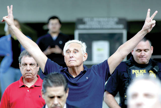 Known for his political antics, conspiracy theories and hard-ball tactics, Stone has reveled in being a Washington wheeler-dealer dating back to the Nixon administration. On Friday, he mimicked Nixon’s famous “V” gesture as he left the courthouse.
