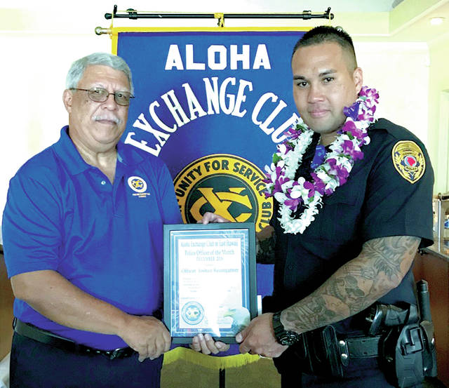 The Aloha Exchange Club of East Hawaii honored Hawaii Police Department Officer Joshua Baumgarner on Jan. 24 as the Officer of the Month for December 2018.
