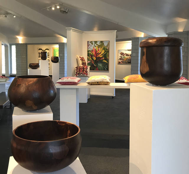 The exhibit features Hawaiian quilts made by members of Kapa Apana o Hilo, along with landscape oil paintings by island artist Steve Irvine. Completing the display is the private collection of Tandy Newsome, “Fit for a King,” which includes 20 wood calabashes made from kou, milo and kamani by master carver Scott Hare.