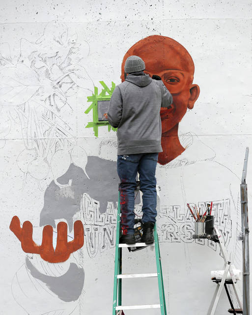 In this Dec. 13, 2018, photo, Muhammad Yungai paints mural on a building near the Mercedes Benz Stadium in Atlanta. A series of about 30 murals on walls around the downtown Atlanta stadium that will host the Super Bowl aims to highlight Atlanta’s civil rights legacy. The murals are part of an initiative called “Off The Wall: Atlanta’s Civil Rights and Social Justice Journey.” (AP Photo/John Bazemore)