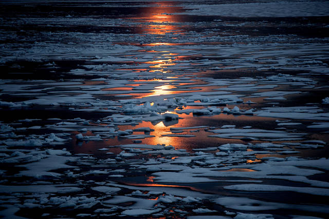 FILE- In this July 23, 2017, file photo the midnight sun shines across sea ice along the Northwest Passage in the Canadian Arctic Archipelago. The magnetic north pole is wandering about 34 miles (55 kilometers) a year. At the end of 2017 it crossed the international date line. That means it’s not even the same day at the new magnetic north pole as it is at the spot of 2010’s magnetic north pole. It’s leaving the Canadian Arctic on its way to Siberia. (AP Photo/David Goldman, File)