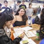 Seniors Kaylee Johnson, 17, center, and Chapel Galante, 18, left, talk with CU Hawaii loan clerk Aime Iyeke about the expenses of family life during the CU Hawaii Finance Reality Fair on Jan. 31 at Waiakea High School in Hilo.