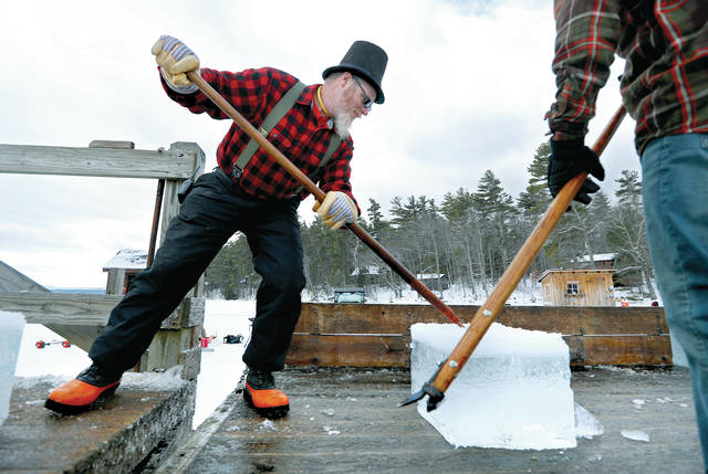 Jon Spence, a resort maintenance worker loading the ice onto the truck, said he prepares for the event each year by watching old movies and videos of ice harvesting. He found a top hat to wear for the occasion but wasn’t able to track down the long coats that were popular among harvesters back in the day.