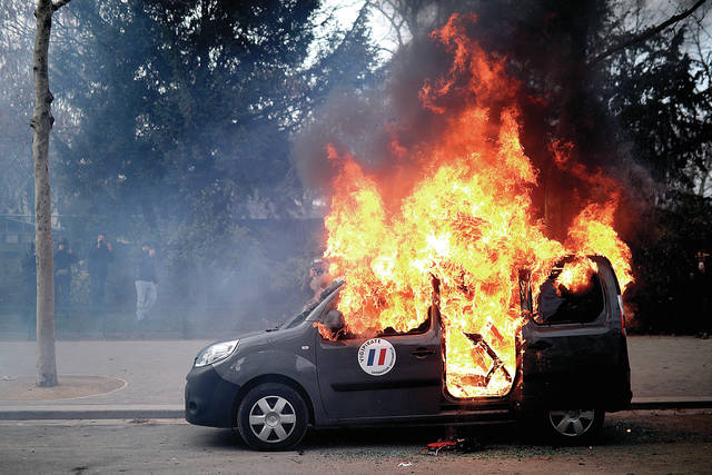 PARIS — A French yellow vest protester’s hand was ripped apart Saturday during violent clashes in Paris as demonstrators tried to storm the French National Assembly in a 13th consecutive week of unrest.