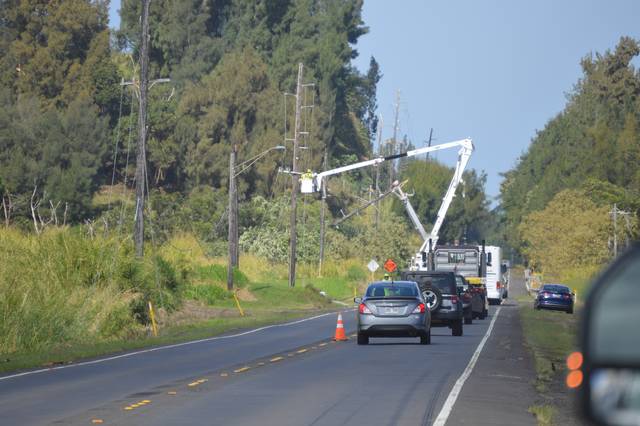 The highway, also known as Hawaii Belt Road, was closed overnight Sunday between mile markers 38 and 39, with one lane reopened early Monday morning. One lane will be closed to traffic again from 7 a.m.-10 p.m. today so crews can work to replace the poles and lines, according to the utility.