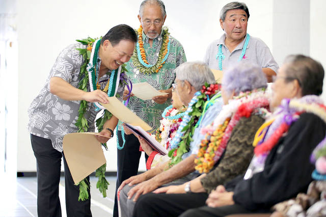 Courtesy photo Newly installed East Hawaii Hiroshima Kenjin Kai President Jon Arizumi, during the 2018 Annual Meeting and New Year’s Luncheon with past president Tommy Goya and honorary Consul General of Japan Art Taniguchi, presents certificates of distinction to members reaching the auspicious age of 88 years.
