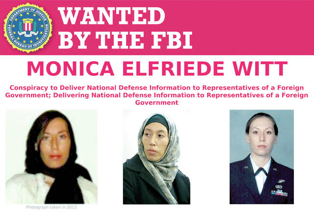 This image provided by the FBI shows part of the wanted poster for Monica Elfriede Witt. The former U.S. Air Force counterintelligence specialist who defected to Iran despite warnings from the FBI has been charged with revealing classified information to the Tehran government, including the code name and secret mission of a Pentagon program, prosecutors said Wednesday, Feb. 13, 2019. (FBI via AP)