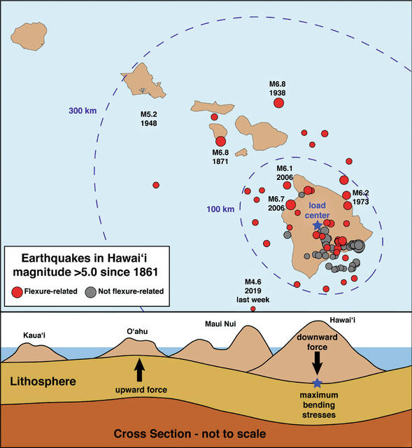 Most earthquakes felt beyond Hawaii Island are presumed flexural earthquakes based on their estimated locations. Some historical examples include the magnitude-6.8 Lanai earthquake Feb. 19, 1871; magnitude-6.8 Maui earthquake Jan. 22, 1938; magnitude-5.2 Oahu earthquake June 28, 1948; magnitude-6.2 Honomu earthquake April 26, 1973; and magnitude-6.7 Kiholo Bay and 6.1 Mahukona earthquakes Oct. 15, 2006.