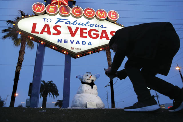 A man, who declined to give his name, takes a picture of a small snowman at the “Welcome to Fabulous Las Vegas” sign along the Las Vegas Strip, Thursday, Feb. 21, 2019, in Las Vegas. Las Vegas is getting a rare taste of real winter weather, with significant snowfall across the metro area in the first event of its kind since record keeping started back in 1937. (AP Photo/John Locher)