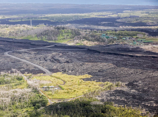 HOLLYN JOHNSON/Tribune-Herald An aerial view from Feb. 15 shows where the 2018 lava flow crossed Highway 132 and where PGV has cut a road through the cooled lava near Highway 132 in Puna.